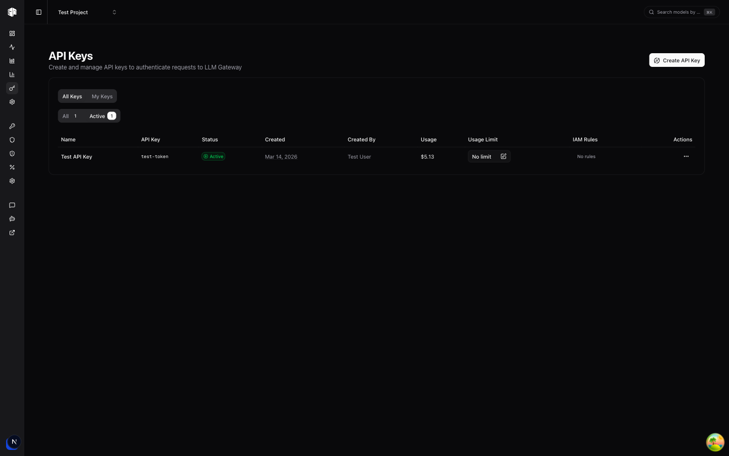 The API Keys page is the main place to create, secure, and operate the keys your apps use to authenticate with LLM Gateway.