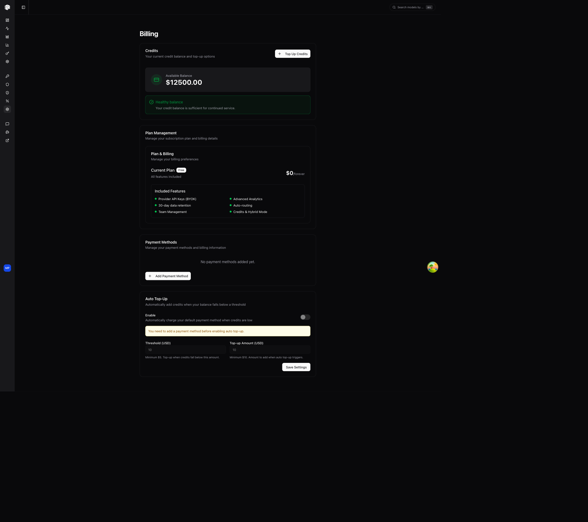 The Billing page is your central hub for managing credits, plans, and payment methods.