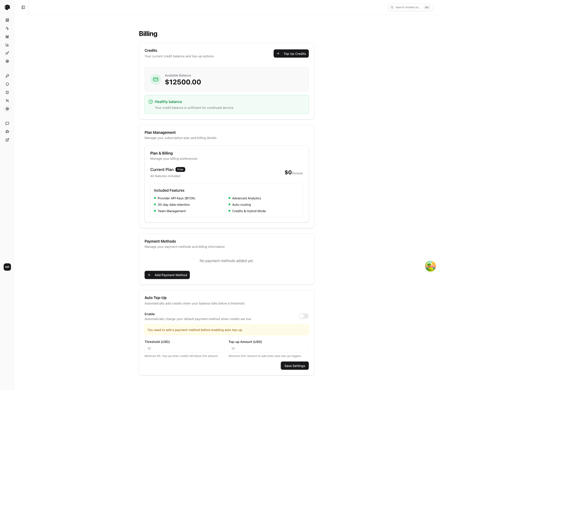 Displays your current credit balance. Credits are consumed as you make API requests through the gateway. Click Top Up Credits to add more credits to your account.