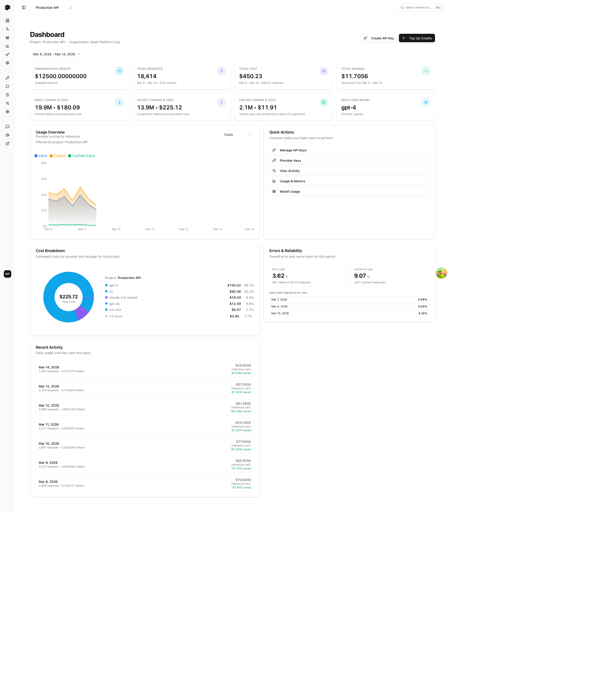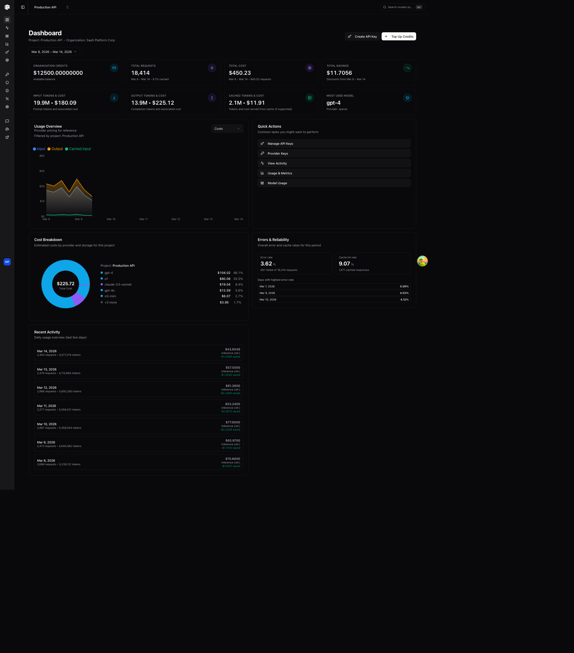 The Dashboard is the first page you see after logging in. It provides a high-level overview of your project's LLM usage, costs, and performance at a glance.