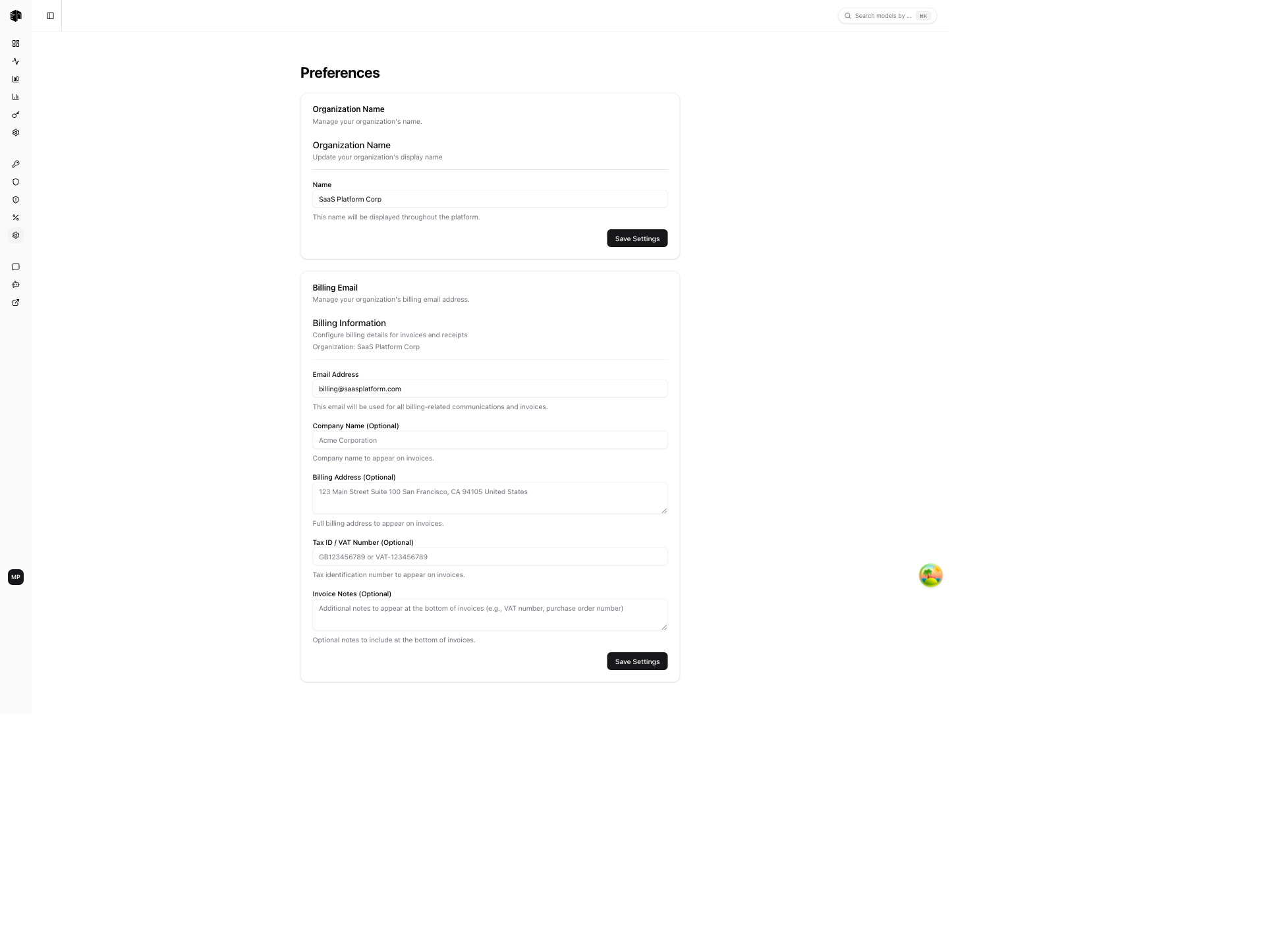 Update your organization's display name. This name appears throughout the dashboard and in billing communications.
