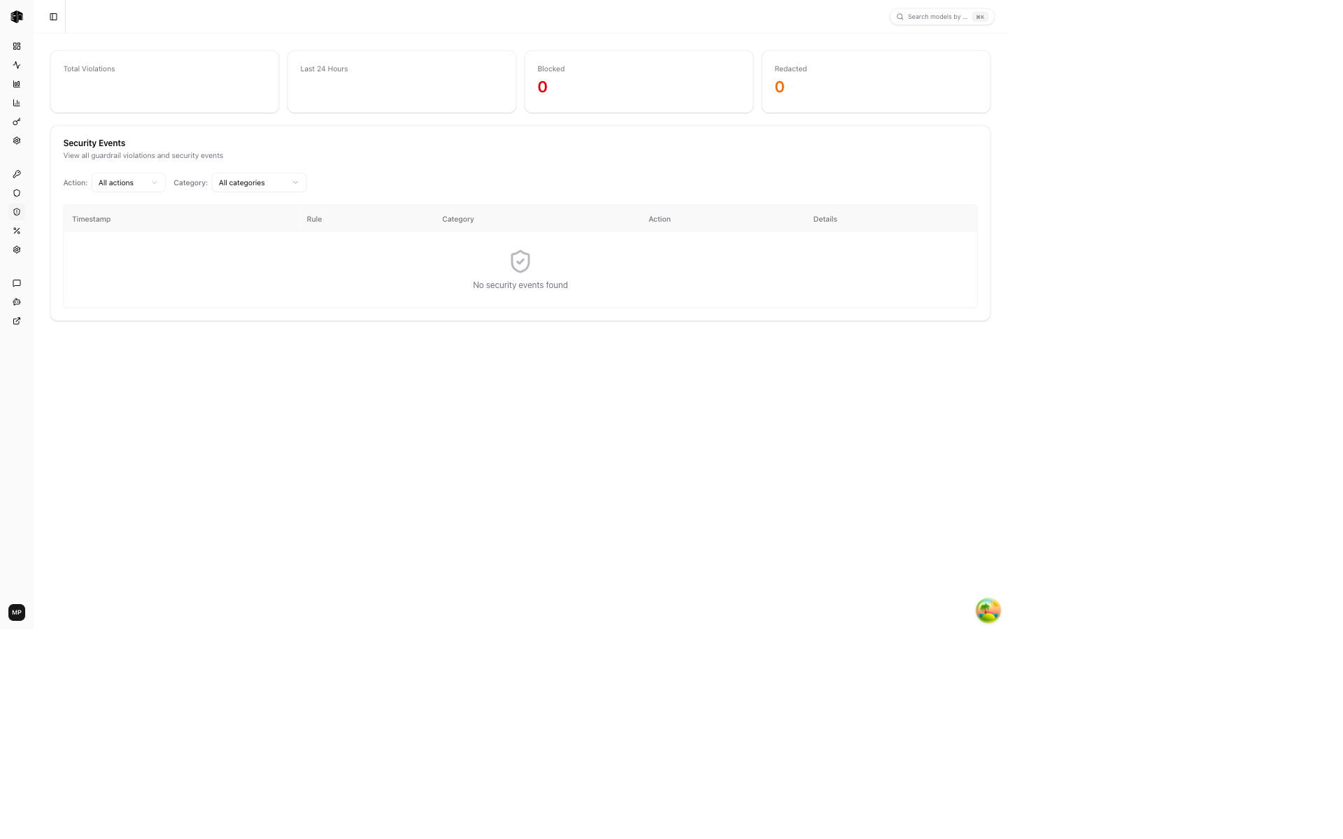 The Security Events page shows all guardrail violations detected across your organization, helping you monitor content safety and policy enforcement.