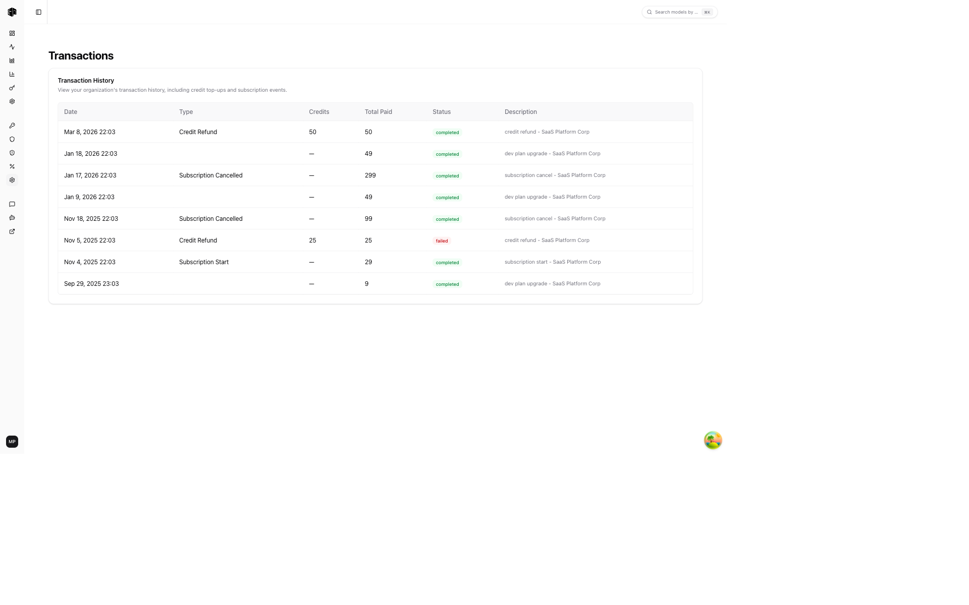 The Transactions page shows a complete history of all financial transactions in your organization.