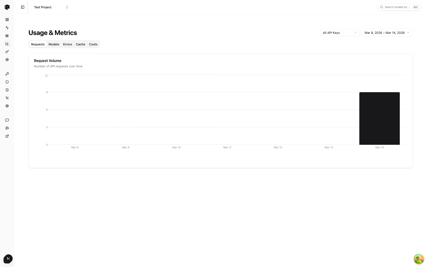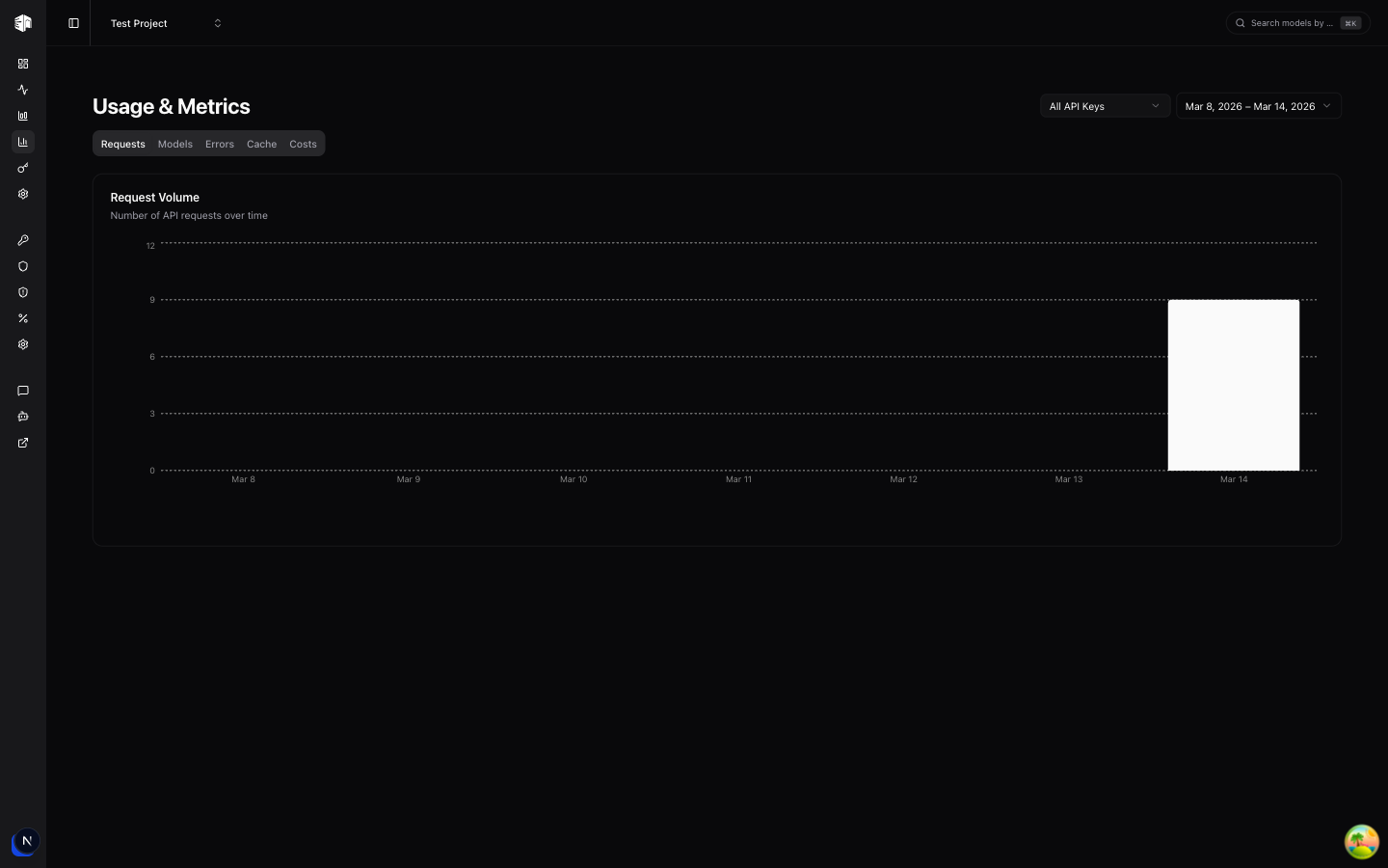 The Usage & Metrics page provides comprehensive analytics through five tabs, giving you deep insight into your LLM API usage patterns.